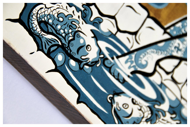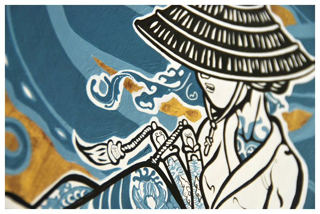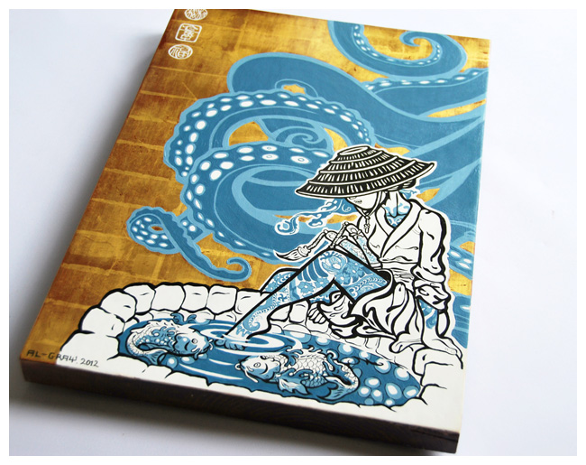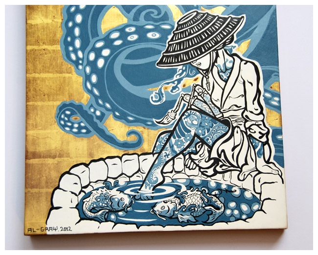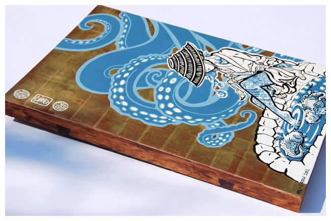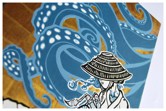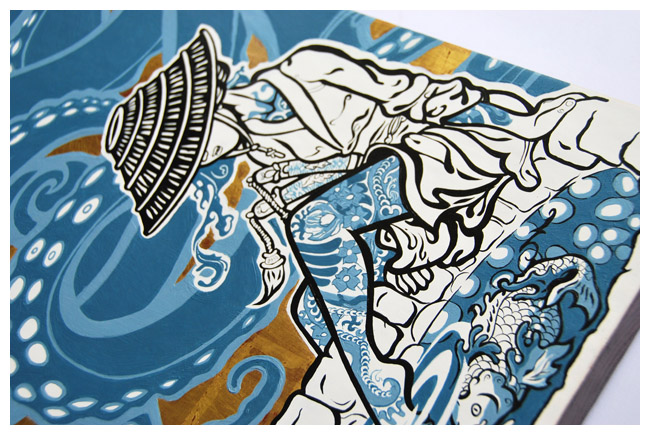 Oil painting on 22c gold leaf panel. Primed with gesso and red bole. Water gilded with gold leaf and burnished with a polished agate stone, approx. 30 x 47cm in size. |
