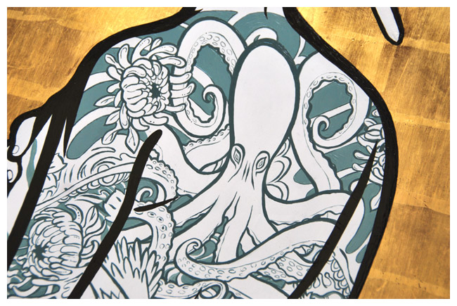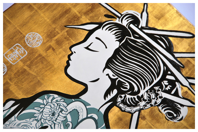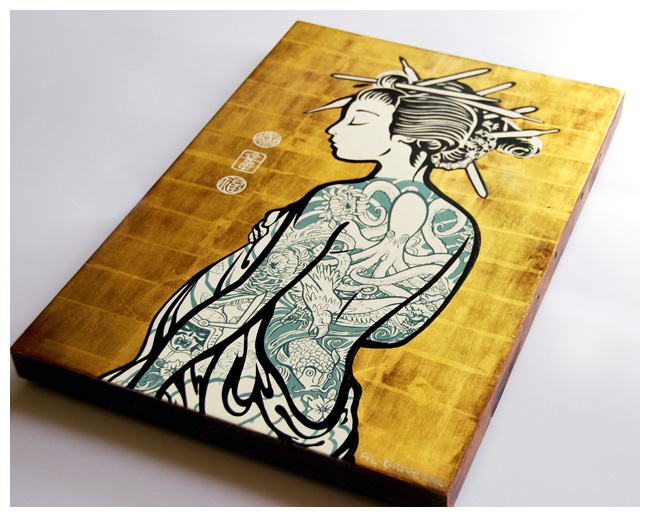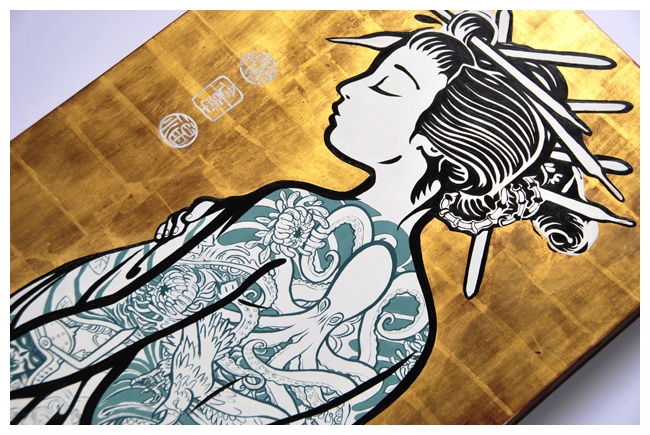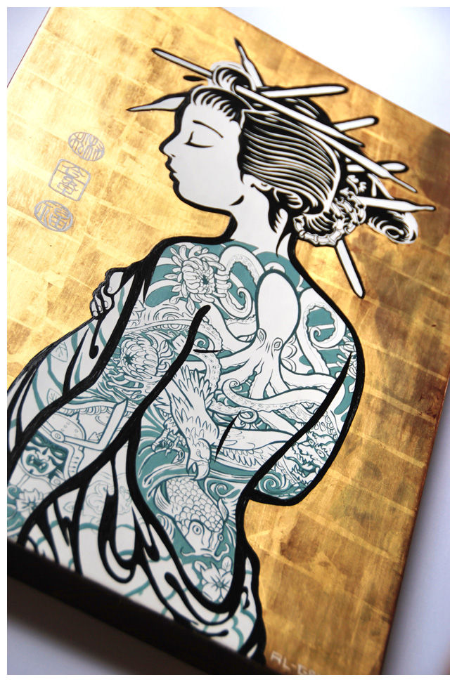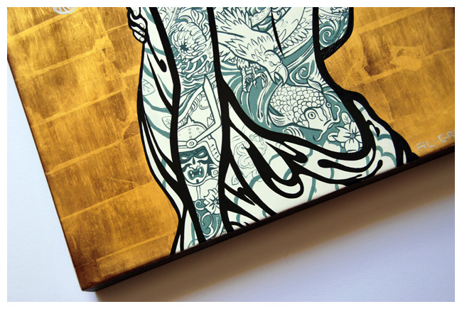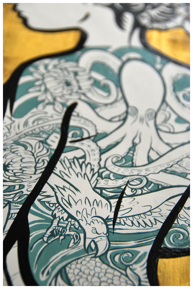 Oil painting on 22c gold leaf panel. Primed with gesso and red bole. Water gilded with gold leaf and burnished with a polished agate stone, approx. 30 x 47cm in size. |