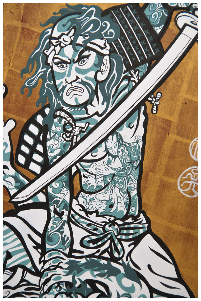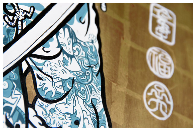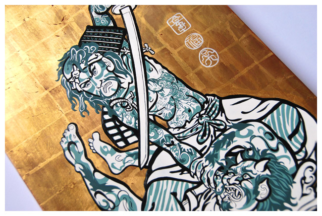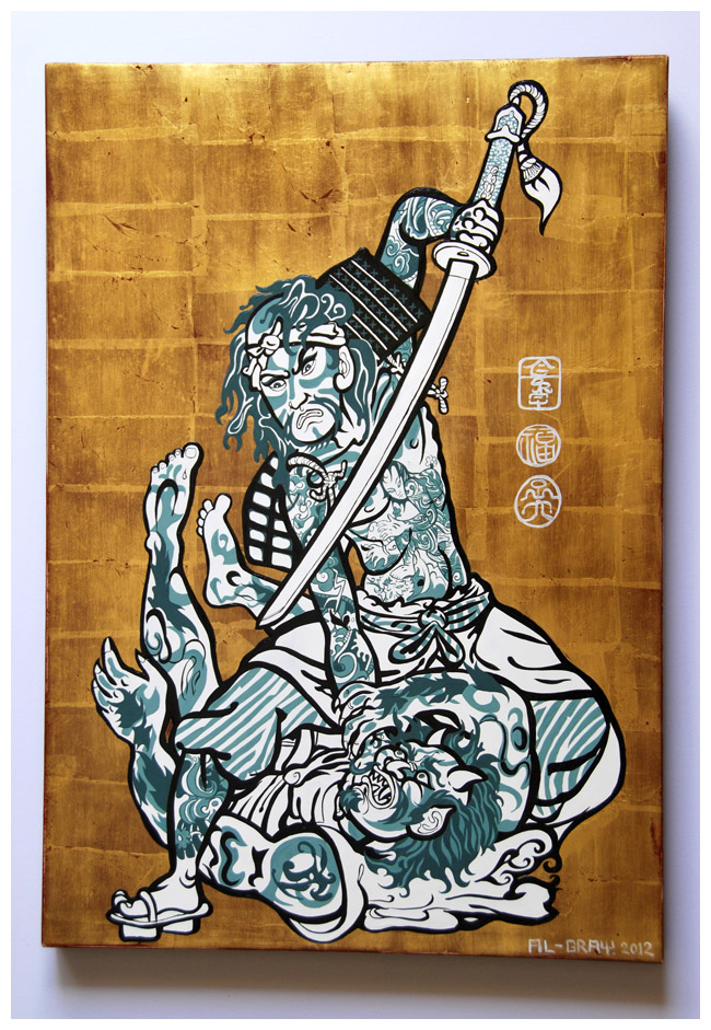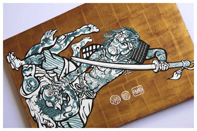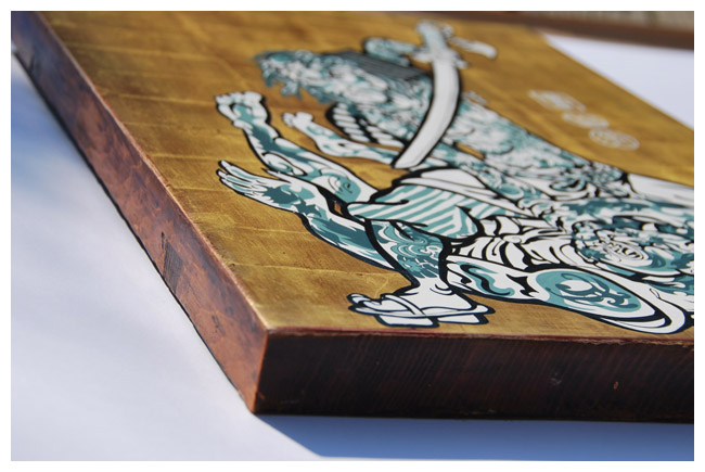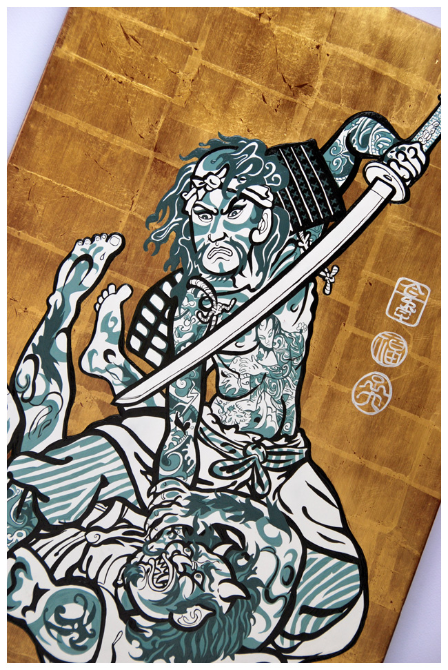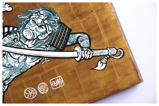 Oil painting on 22c gold leaf panel. Primed with gesso and red bole. Water gilded with gold leaf and burnished with a polished agate stone, approx. 30 x 47cm in size. |
