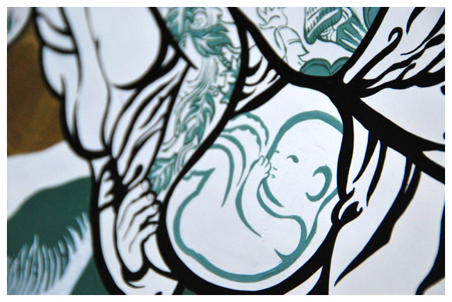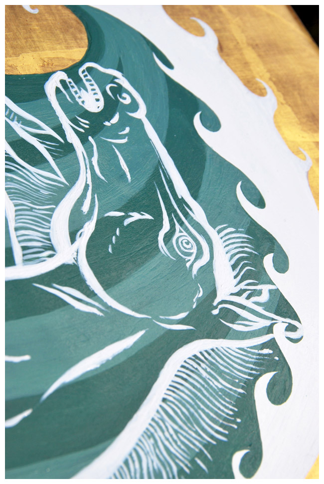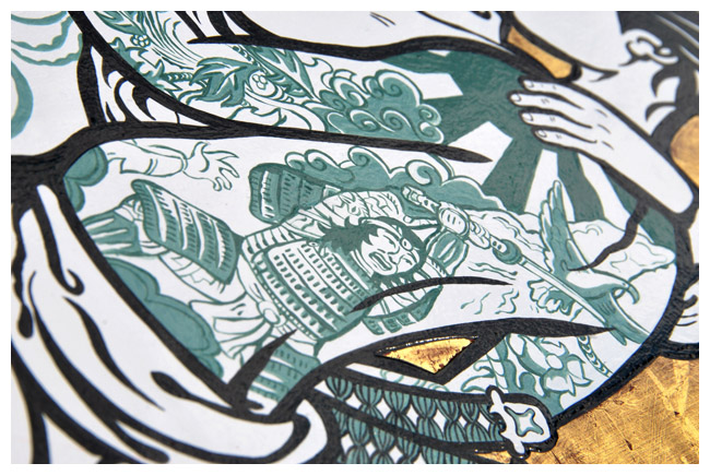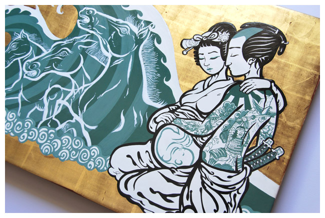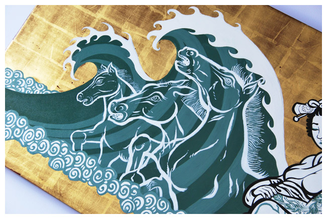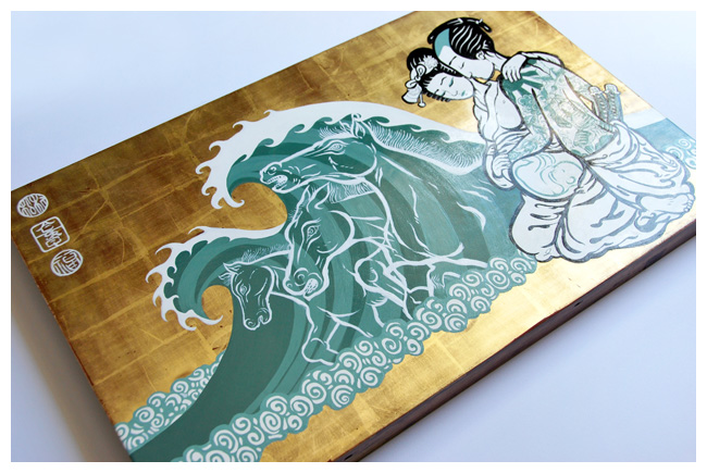 Oil painting on 22c gold leaf panel. Primed with gesso and red bole. Water gilded with gold leaf and burnished with a polished agate stone, approx. 30 x 47cm in size. |