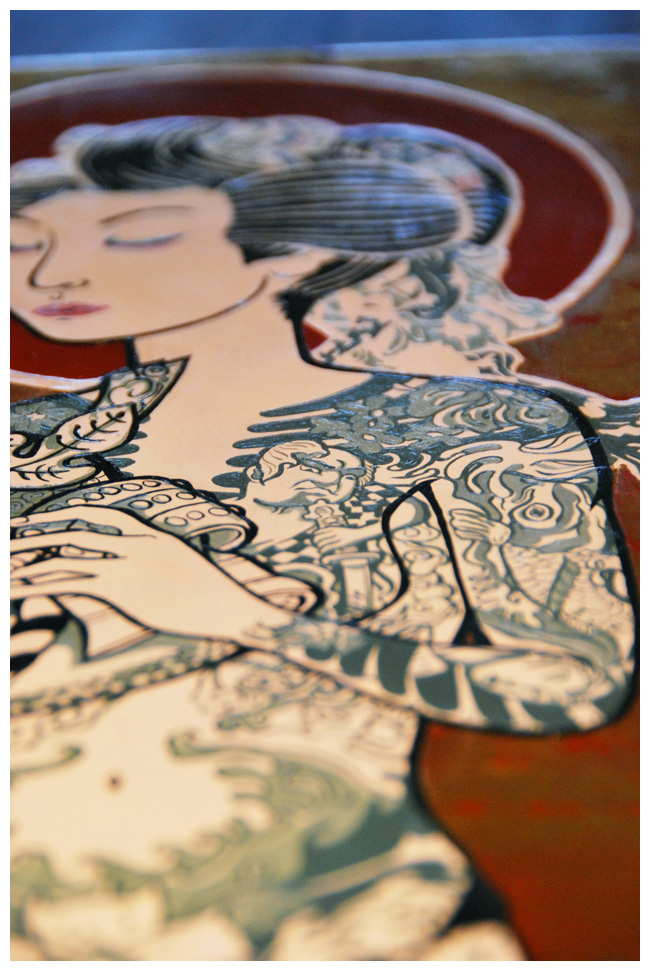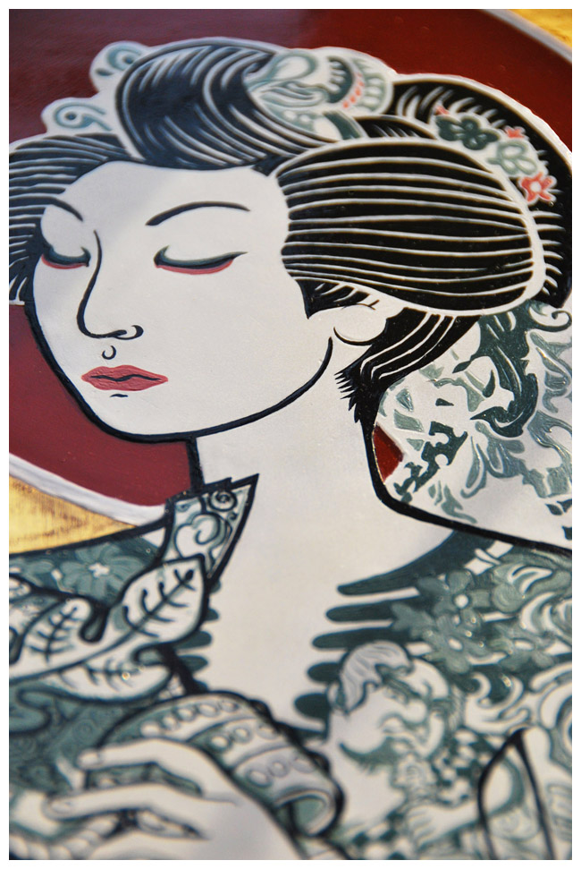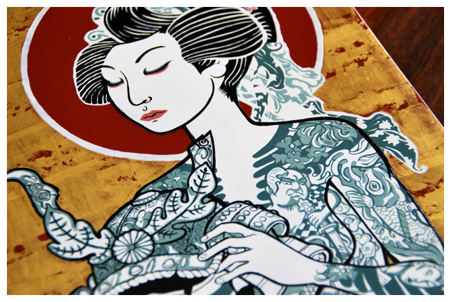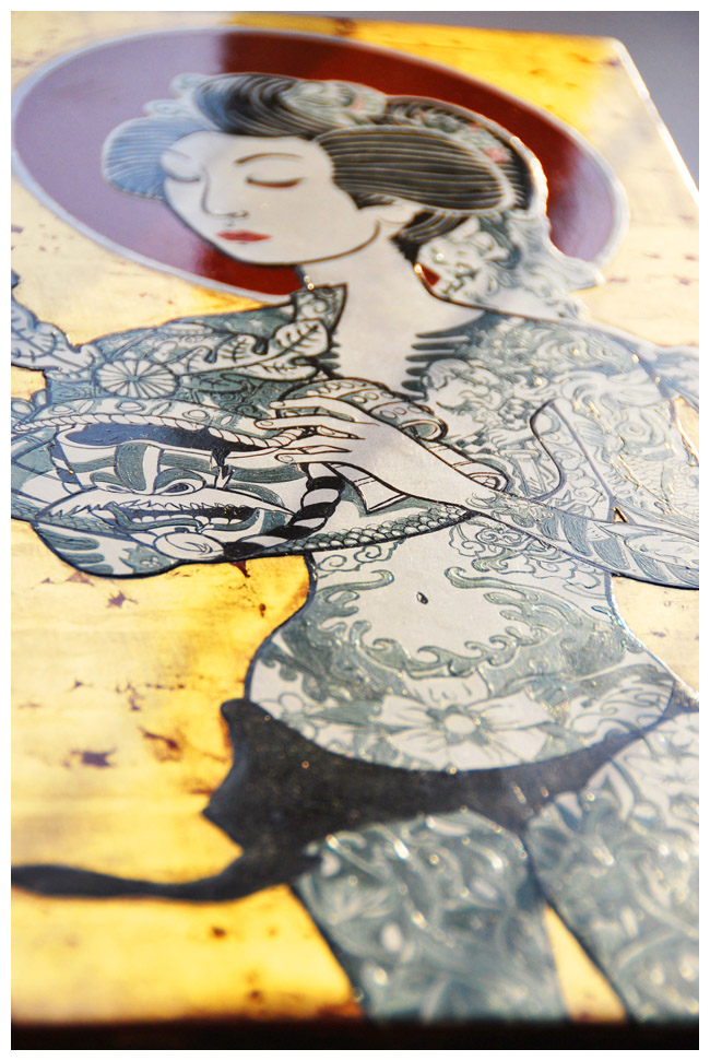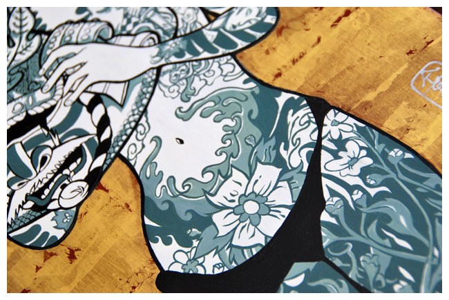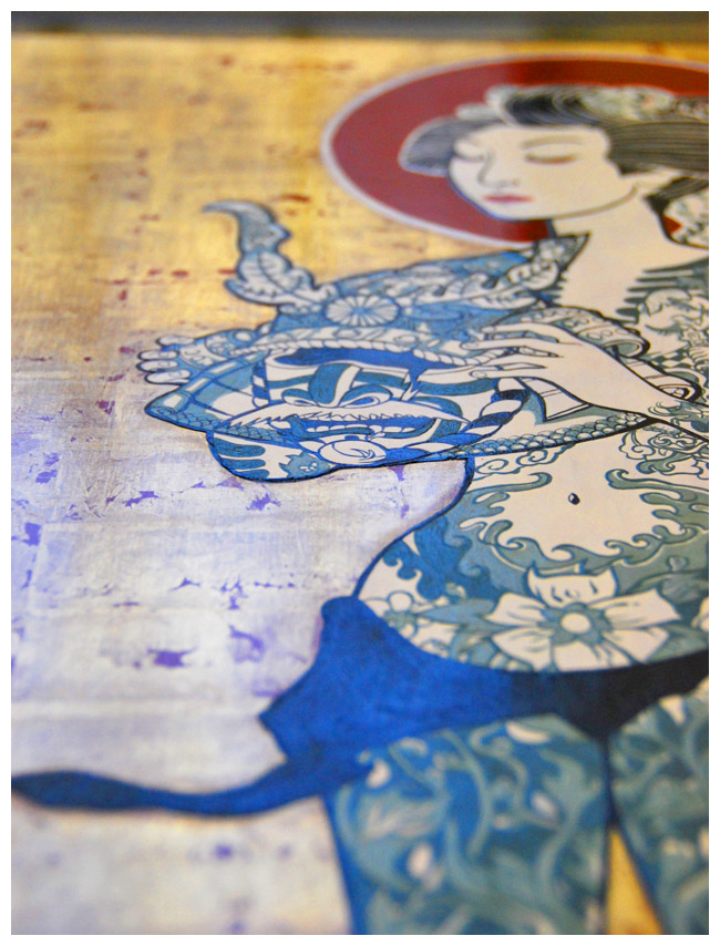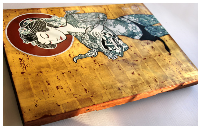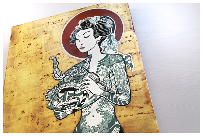 Oil painting on 22c gold leaf panel. Primed with gesso and red bole. Water gilded with gold leaf and burnished with a polished agate stone, approx. 30 x 47cm in size. |