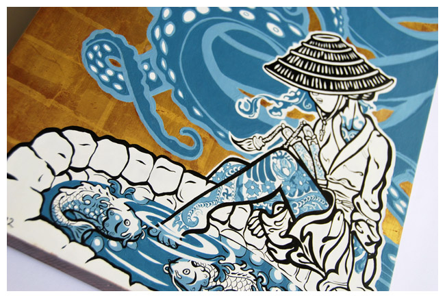 In his latest collection, Gray's extensive research into religious iconic panels has led him to fuse his Japanese "Tattoo" theme with those ecclesiastical emblems of the last two millennia.