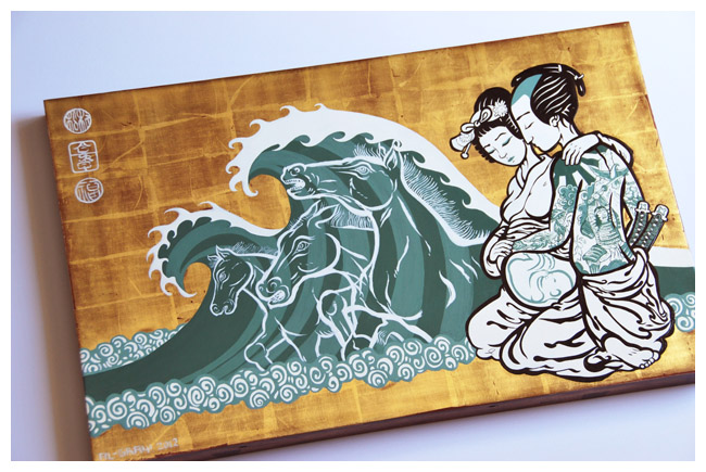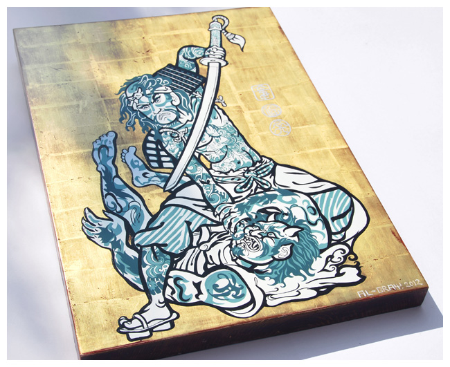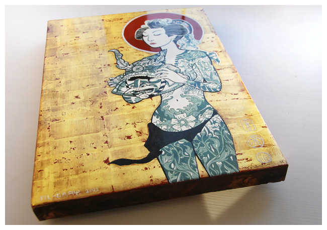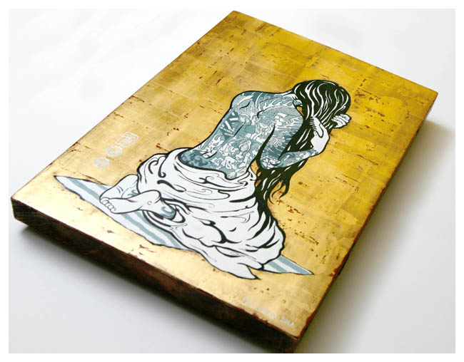 Gray has adopted the same traditional methods used for centuries to create his iconic panels: A pitch pine panel is built up with gesso and a polished bole, then gilded in 22c gold leaf. The gold is burnished with a polished agate stone to press the gold down into the bole, then distressed and worn through to reveal the beautiful red bole beneath the gold. The figure is built up in layers of impasto and carefully sanded and smoothed ready for oil panting. The final work is sealed with a hand made varnish and is approx. 30 x 47cm in size.